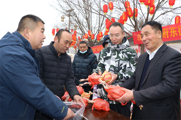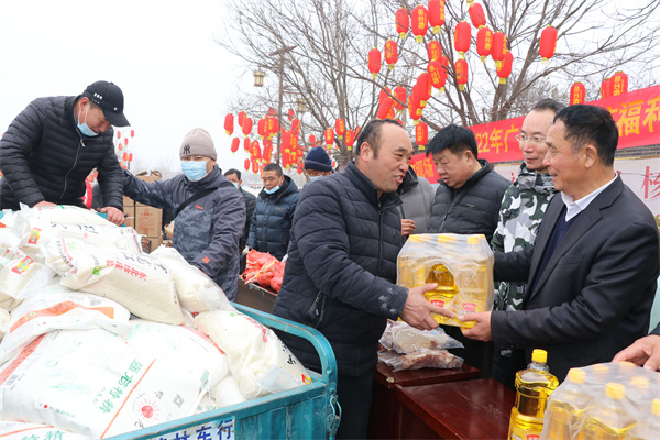 1月25日,永年區(qū)廣府古城東街村村民在村委會(huì)門口上排起了長龍隊(duì),甘露寺廣場上亦是搭起了舞臺(tái),臺(tái)下坐滿了70歲以上老人,現(xiàn)場每一個(gè)人們臉上都洋溢著燦爛的笑容。東街村委會(huì)門口兩旁,整齊地碼著米、面、油、肉、糖等十幾種年貨,今年是東街村黨支部書記宋福如為村民置辦年貨的第十三個(gè)年頭。據(jù)悉,今年為村民置辦的年貨種類達(dá)12樣之多:2斤帶魚、1只白條雞、2斤豬肉、1桶色拉油、1瓶香油、20斤大米、20斤精粉、10斤餃子粉、1袋糖塊、1袋瓜子、1袋花生、1袋粉條,讓全村人過春節(jié)不用再花一分錢。在保證村民日常需求之外,讓村民新年品嘗新味道,讓東街村新年充滿新氣象!